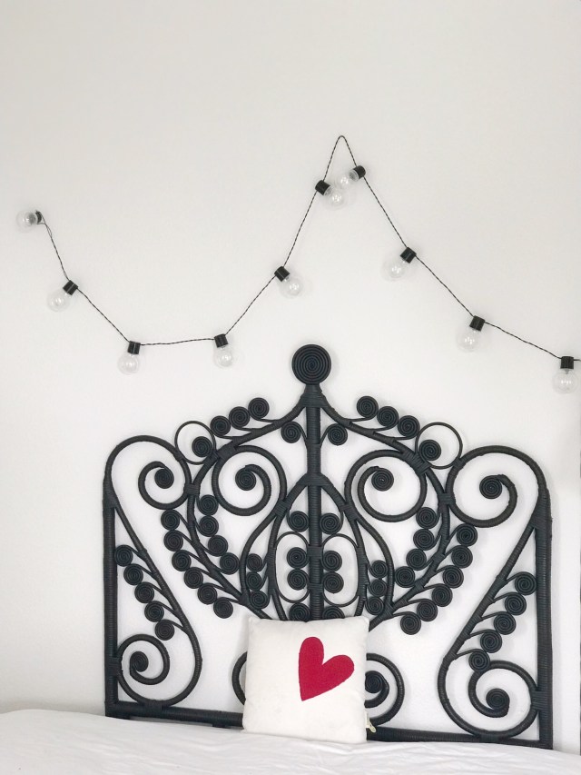 Pour être tendance à moindre coût, cet été, je lui ai trouvé une tête de lit en rotin Peacock sur Leboncoin pour 15 euros. C’est une réédition Alinéa. Je l’ai relookée avec 2 bombes de peinture noire matte pour 15 euros. Et même si elle n’est pas à la taille de son lit, elle fait vraiment son effet.