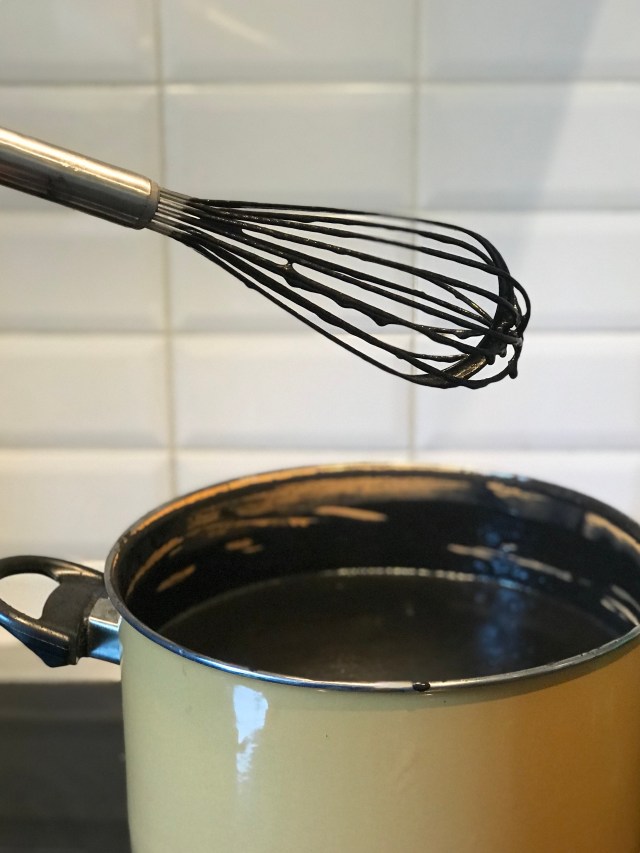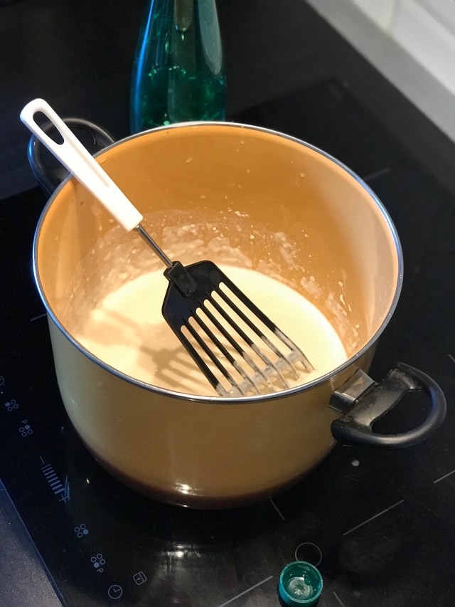 Pour pouvoir faire chauffer notre peinture, j’ai trouvé un vieux faitout et une spatule chez Emmaüs pour 4 euros.