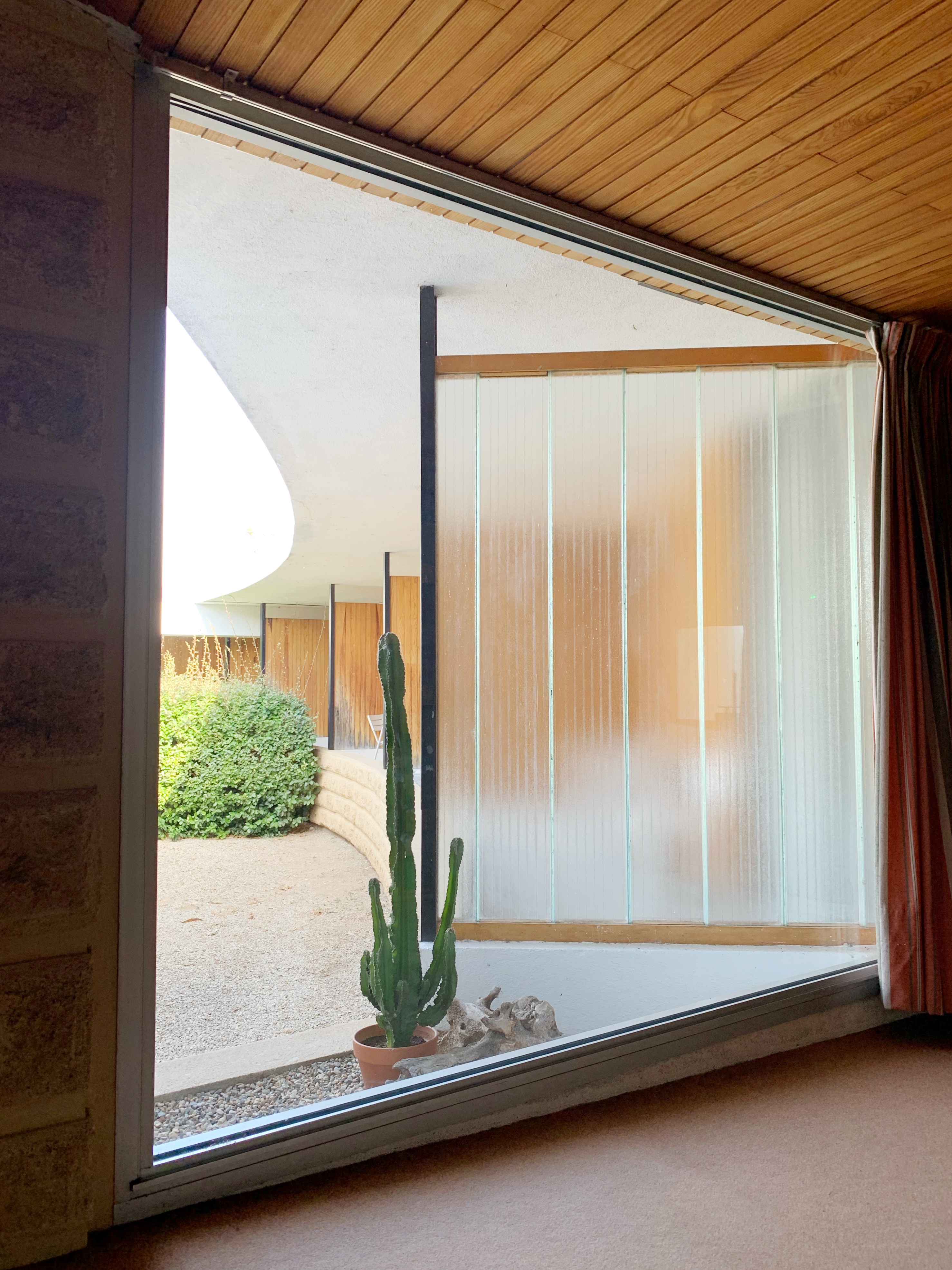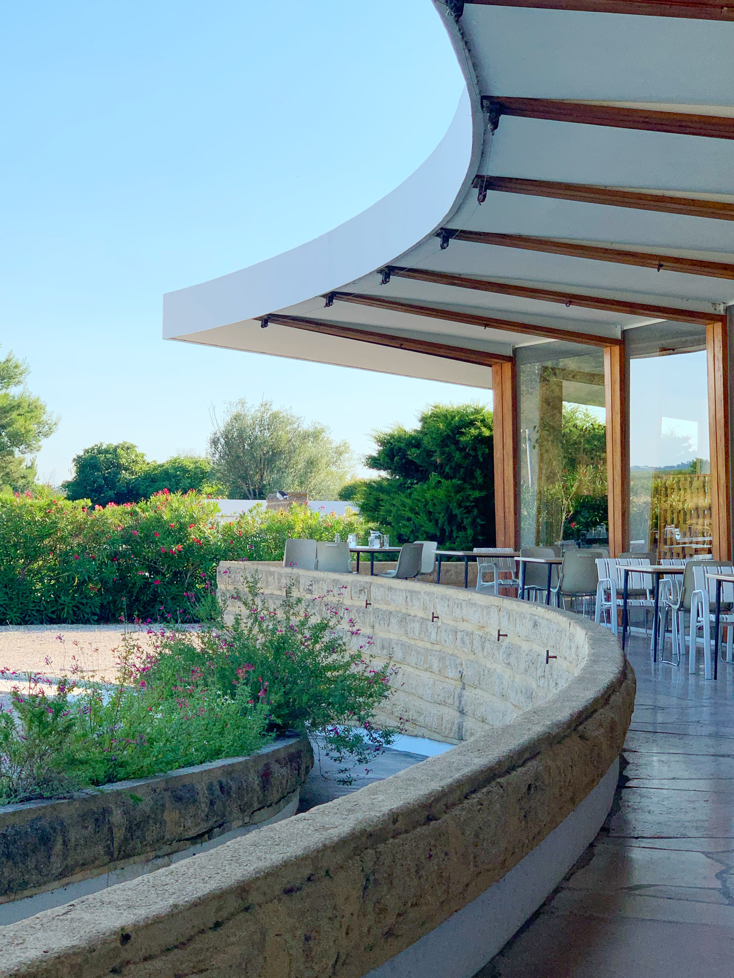 Ce qui fait le charme de l’hôtel c’est sa structure en 3 arcs de cercle (1er arc pour la réception et le restaurant, 2ème et 3ème arcs pour les chambres) qui s’ouvrent sur l’environnement et notamment sur la piscine située au cœur.